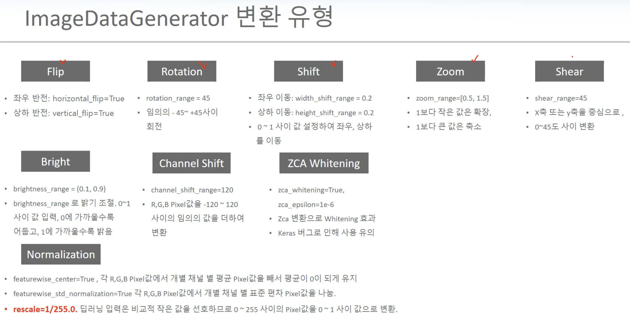 -ImageDataGenerator 적용 => train 에만! => test, valid는 augmentation 적용하면 안됨 rescale만 적용