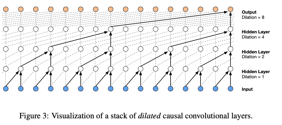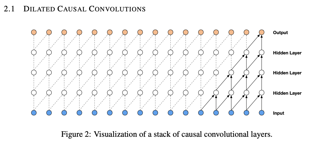 스택된 dilated causal convolution layer는 몇 개 레이어만으로 네트워크가 매우 큰 수용 필드를 가질 수 있도록 해주면서도