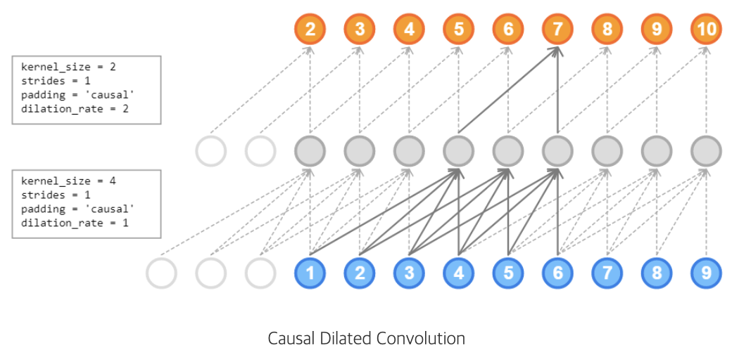 => 필터가 일정한 간격으로 input을 건너뛰어 큰 영역에 적용되는 인과합성곱