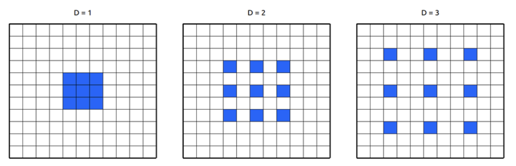 dilation 크기 증가 => input 간격 증가 => receptive field 증가