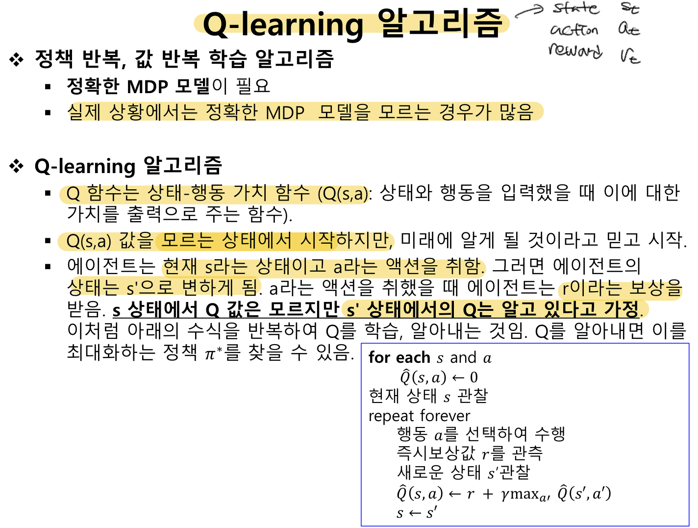 => 가치 q 값을 모르는 상태에서 시작, 다음 상태에서의 q는 알고 있다! => 계속하여 상태를 학습하며 q를 학습한다. q를 알면 이를 최대화하는 정책을 찾을 수 있다