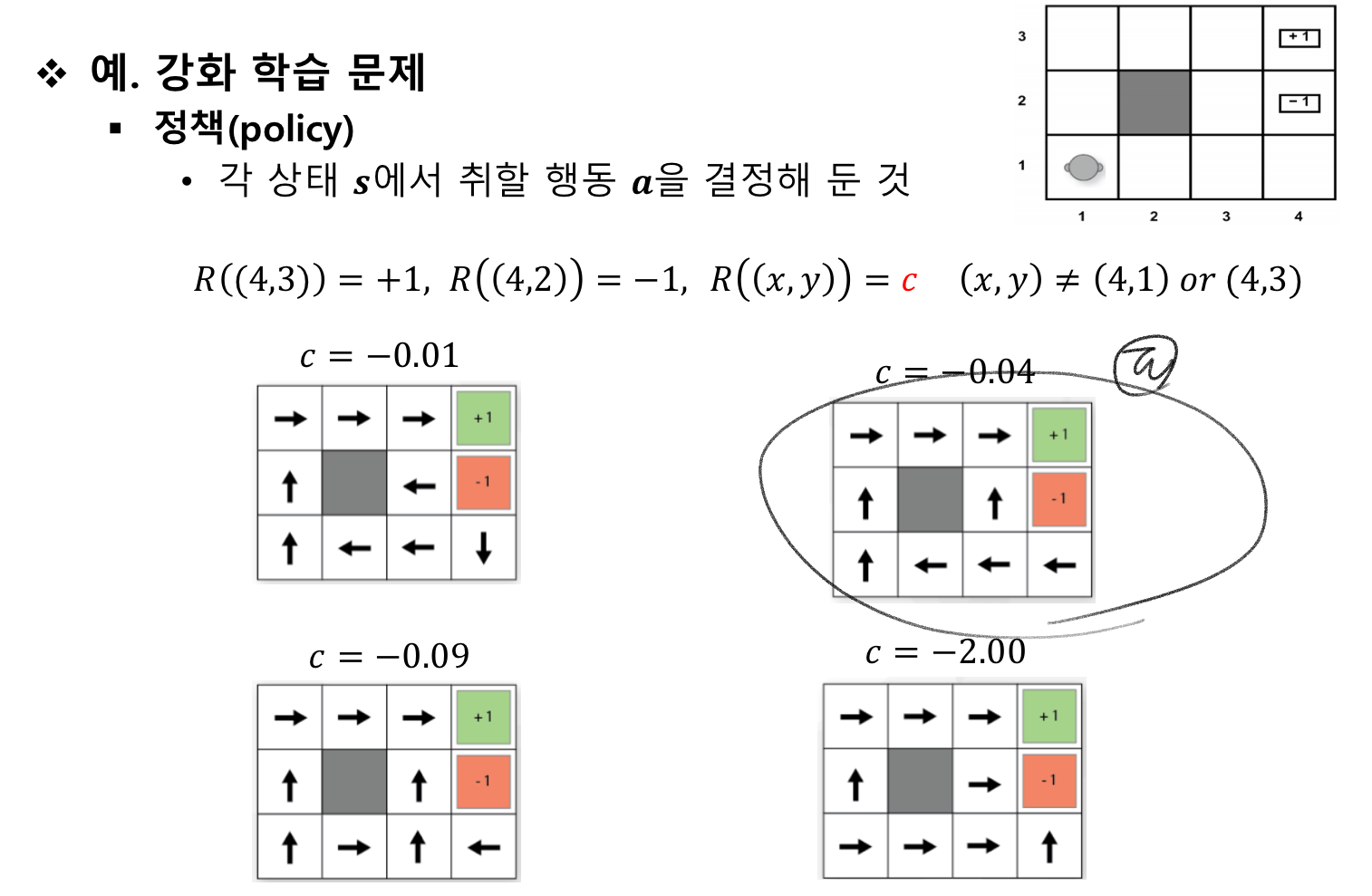 => 강화학습의 목적 : 기대 누적 보상값이 최대가 되도록 하는 정책을 찾는 것