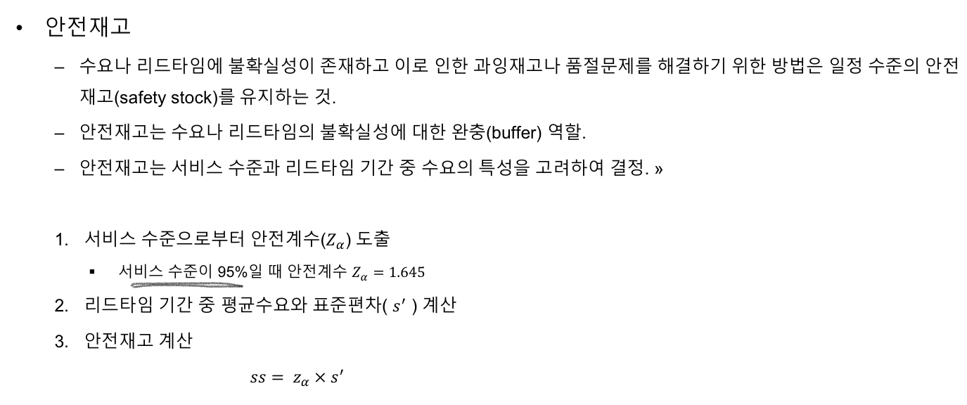 안전재고 : 수요와 리드타임의 불확실성을 해결하기 위해 일정 수준의 안전재고 유지 = buffer