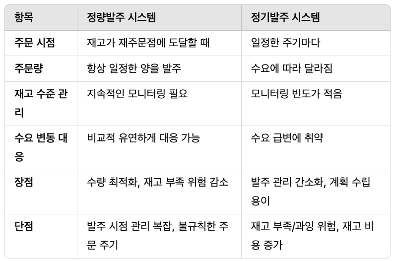 단점 : 발주 시점 모니터링, 불규칙한 발주시기로 인해 공급업체와의 소통 중요, 변동 수요에 취약함