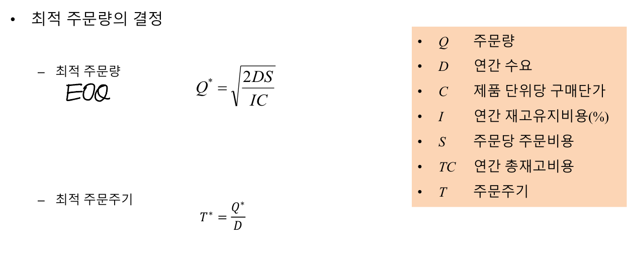 - 주문 비용 및 재고 보유 비용을 포함한 비용 고려 : 주문 비용 (제품 비용, 운송 비용) | 재고 보유 비용 (기회비용, 노후화비용 등)