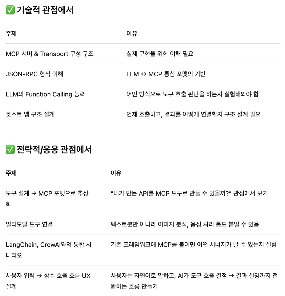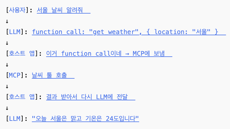 | 호스트 앱 | LLM 응답 분석 / MCP 호출 시기 결정 / 응답 전달 | MCP와 LLM 사이의 조율자 |