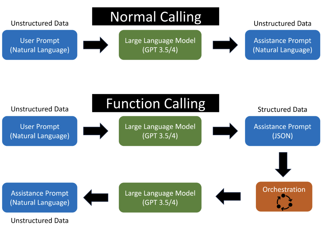 GPT-4와 같은 LLM은 함수를 호출해야할 때를 감지한 후 함수를 호출하기 위한 인수가 포함된 json을 출력하도록 되어있다.